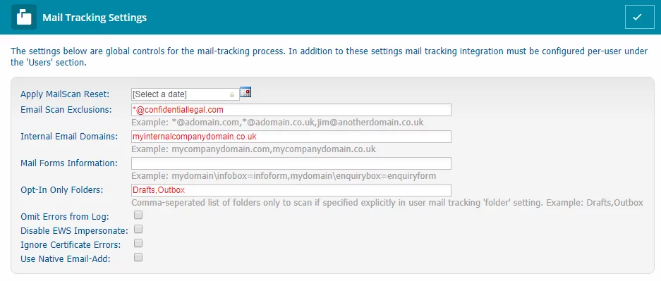 | Internal Email Domains | Internal email domains format = domain.com multiple can be comma separated. This is important to prevent tracking of internal mail. |