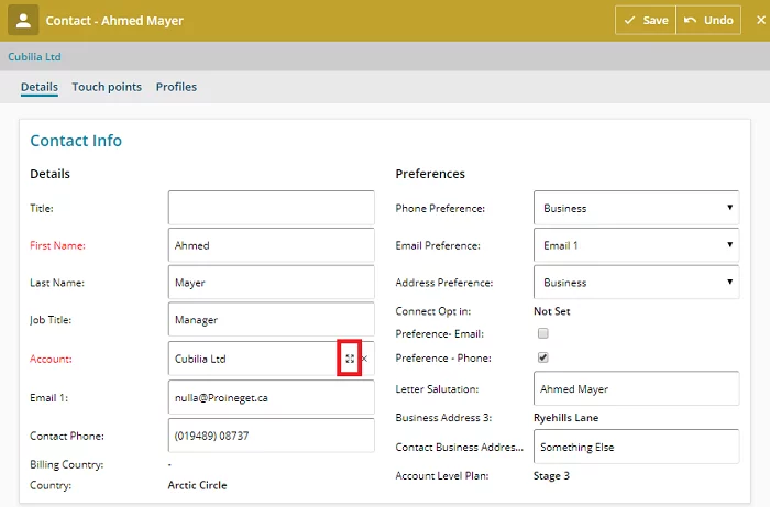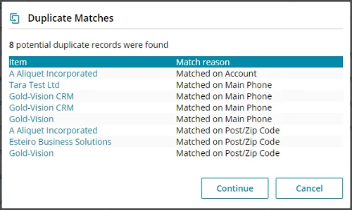 When adding or amending an Account or Contact, Gold-Vision can run a duplicate check.