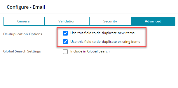 To do this go to Settings – open Account or Contact – locate the field – click the Ellipsis Icon – select Configure – click on the Advanced tab – set the De-Duping checks on new and/or existing items.